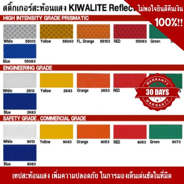 - สติ๊กเกอร์สะท้อนแสง 3M มีให้เลือกหลากหลายสี หลายเกรด ซึ่งทำให้ เลือกได้เหมาะสมตามความต้องการของลูกค้า