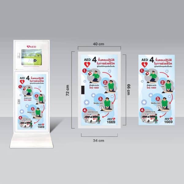 - มีสติ๊กเกอร์ พร้อมขั้นตอนการช่วยฟื้นคืนชีพ ขั้นพื้นฐานตามข้อกำหนดของสถาบันการแพทย์ฉุกเฉินแห่งชาติ ผู้ใช้อ่านเข้าใจได้ง่าย พร้อมขนาดตัวอักษรอ่านได้ชัดเจน และที่สำคัญการออกแบบได้คำนึงถึงการใช้งานที่ผู้ใช้สามารถเปิดใช้ ได้ทันทีเมืออยู่ในสถานการณ์ฉุกเฉิน