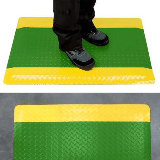 แผ่นกันเมื่อย รุ่นป้องกันไฟฟ้าสถิตย์ วัสดุ ภายนอก PVC ภายใน เบาะโฟม SBR ขนาด 100x50x2 Cm. สีเขียวเหลือง