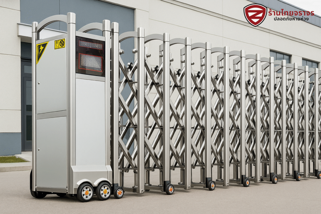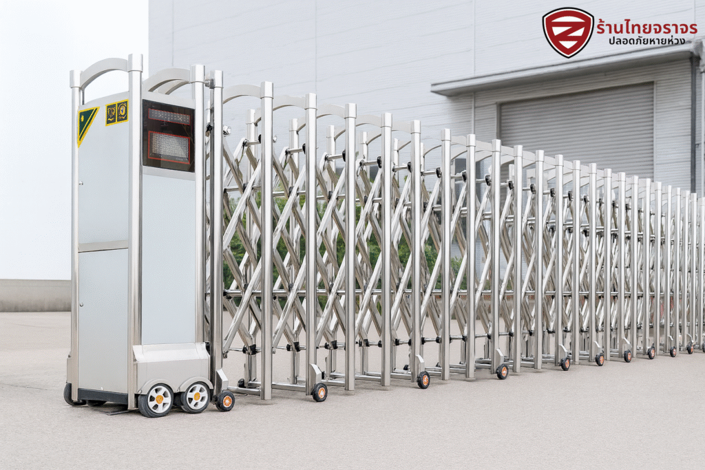 ประตูรั้วอัตโนมัติแบบเลื่อนยืดหดได้ ใช้มอเตอร์ไฟฟ้าขับเคลื่อน เปิด-ปิดผ่านรีโมทโครงสร้างทำจากสแตนเลสคุณภาพสูง (304) ดีไซน์ทันสมัย แข็งแรง ทนต่อทุกสภาพอากาศ เหมาะสำหรับบ้านพัก, โครงการหมู่บ้าน, โรงงาน และอาคารพาณิชย์