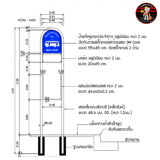 โครงป้ายสเเตนเลสที่หยุดรถประจำทาง พร้อมป้ายรถเมย์ ขนาด 55×45 ซม. ติดสติ๊กเกอร์สะท้อนเเสงสีน้ำเงิน 3M COM เเละป้ายอลูมิเนียม ขนาด 20×45 ซม. แผ่นเปล่า