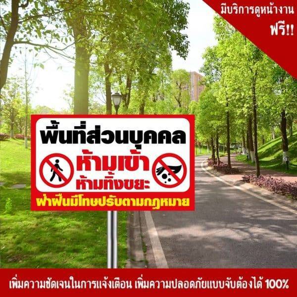 ป้ายพื้นที่ส่วนบุคคลห้ามเข้าห้ามทิ้งขยะ ฝ่าฝืนมีโทษปรับตามกฎหมาย อลูมิเนียม หนา 1.2 mm. 20×30 Cm. 3M Safety Grade (รับประกัน 1 ปี)