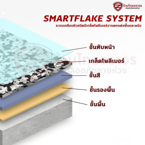 - ชั้นทับหน้า ผสม Smart flake Topcoat จากนั้น ใช้ลูกกลิ้งทาชั้นสีใสทับหน้าเพื่อเคลือบ Color Flake 2-3 รอบ โดยปล่อยให้รอบแรกแห้งก่อนอย่างน้อย3-4 ชั่วโมง จึงทารอบถัดไป ทิ้งให้ระบบแห้งเป็นเวลาข้ามคืน จึงสามารถเข้าใช้พื้นที่ได้ ระบบแห้งตัวเต็มที่ 4-5 วัน