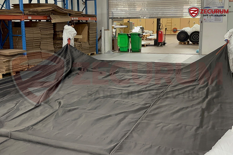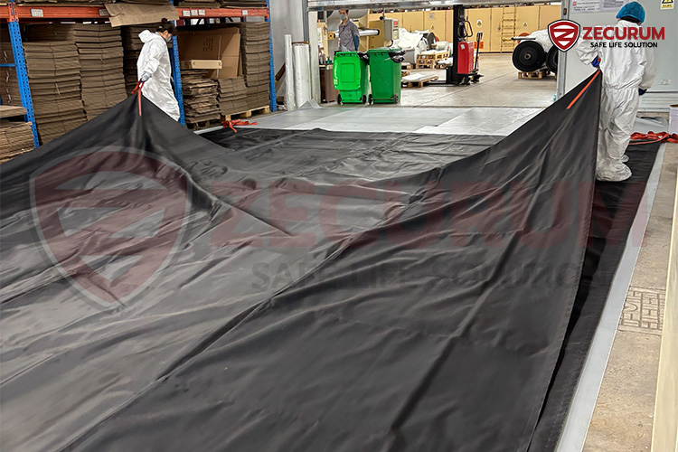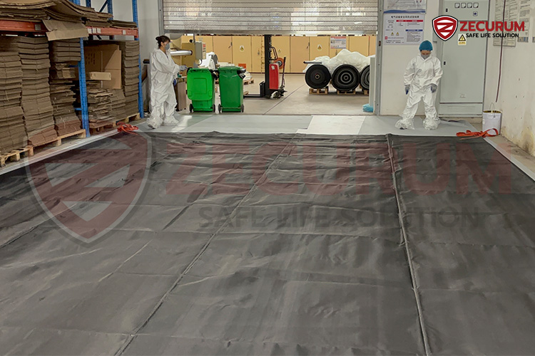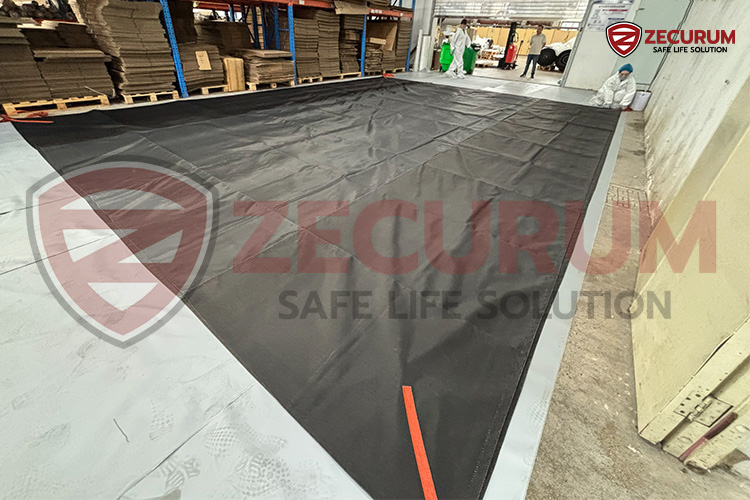 - ต้องใช้ อย่างน้อย 2 คน จับที่หูจับของฝั่งด้านสั้น แล้วรีบยกขึ้นเพื่อคลุมรถที่ไฟไหม้