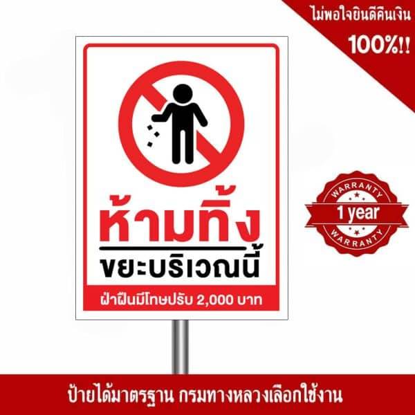 ป้ายห้ามทิ้งขยะบริเวณนี้ ฝ่าฝืนปรับ 2,000 บาท อลูมิเนียม หนา 1.2 mm. 20×30 Cm. 3M Safety Grade (รับประกัน 1 ปี)