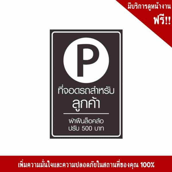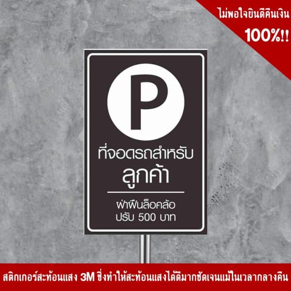 - ป้ายที่จอดรถสำหรับลูกค้า ฝ่าฝืนล็อคล้อปรับ 500 บาท อลูมิเนียม หนา 1.2 mm. 20×30 Cm. 3M Safety Grade (รับประกัน 1 ปี)