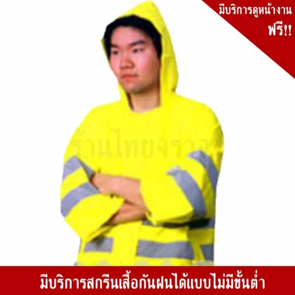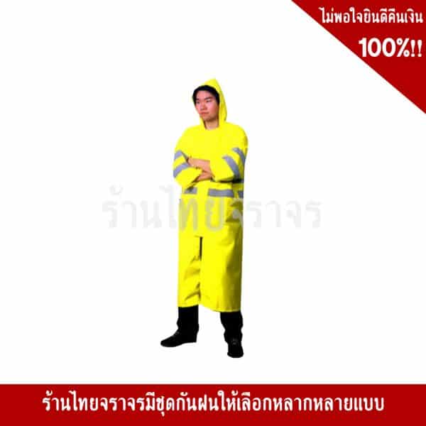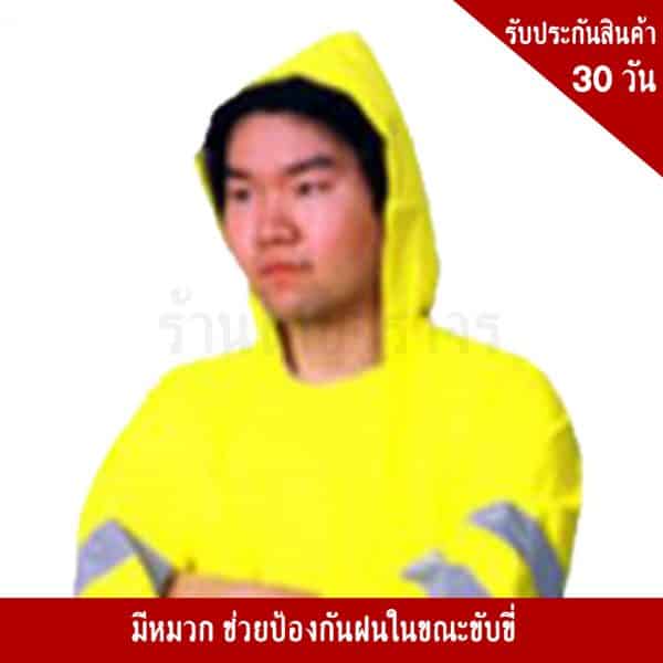 - เสื้อโค้ทกันฝน สีเหลือง คาดแถบสะท้อนแสง มีหมวก