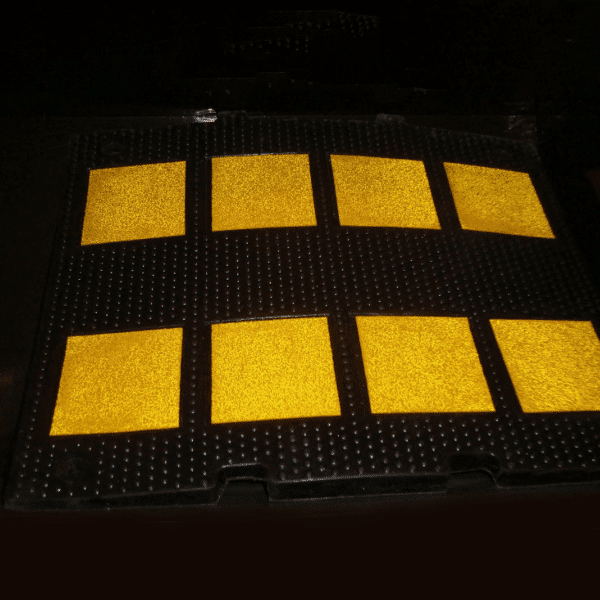 ชื่อสินค้า : ยางชะลอความเร็ว พร้อมสติ๊กเกอร์สะท้อนเเสงสีเหลือง ขนาด 60x50x3 Cm.