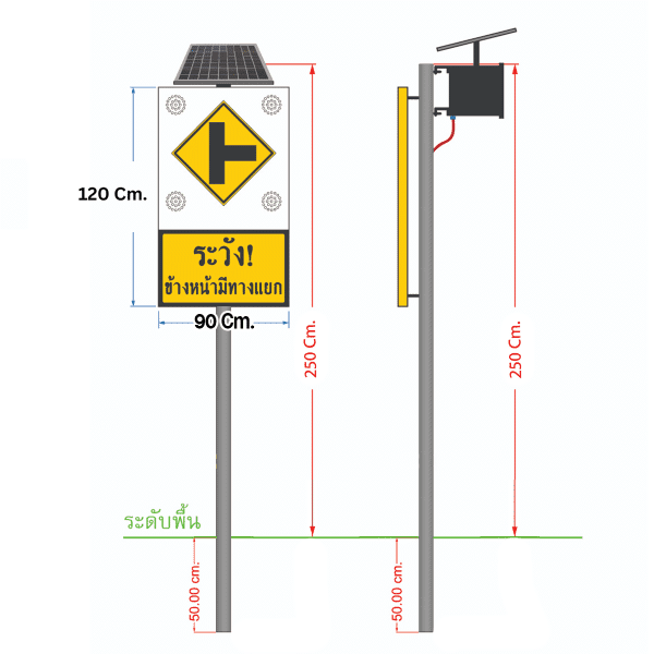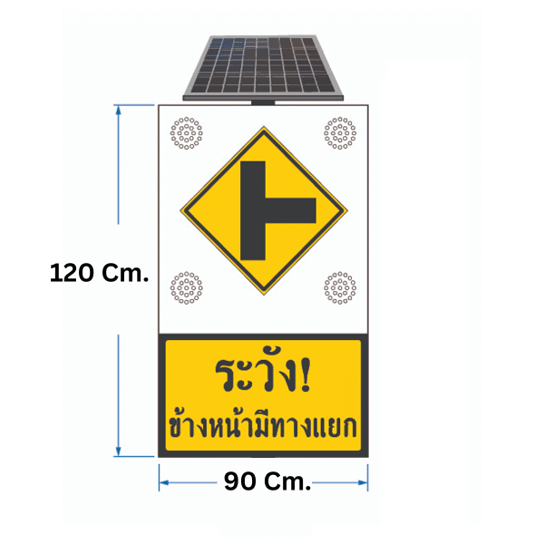 ป้ายไฟกระพริบ “ระวัง! ข้างหน้ามีทางแยก” ขนาด 90×120 Cm. ระบบโซลาร์เซลล์ (ไม่รวมเสา)