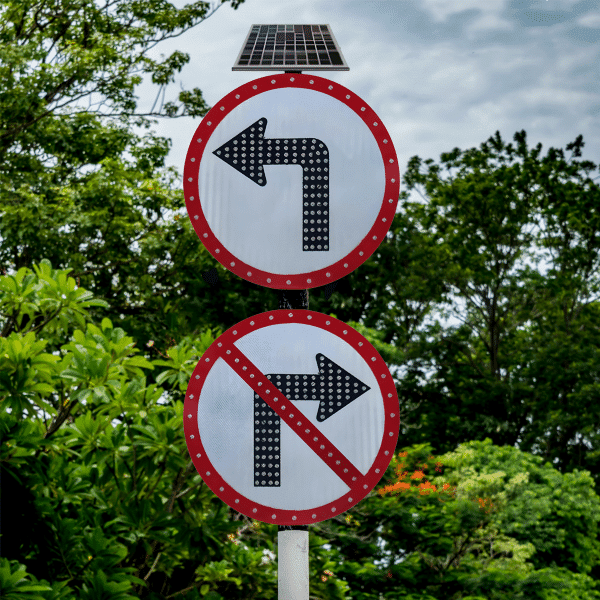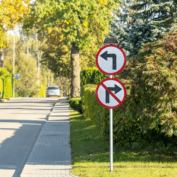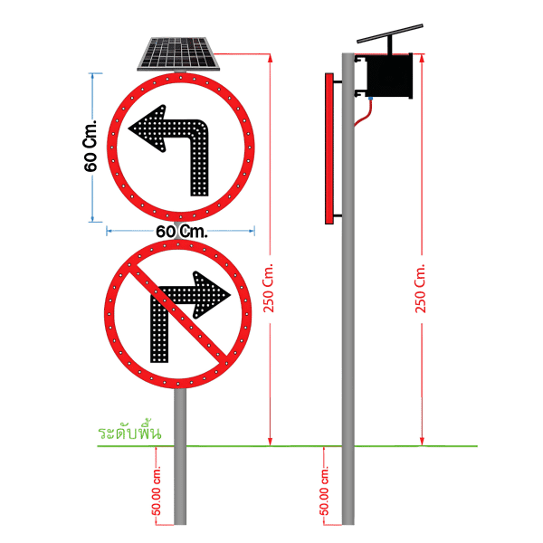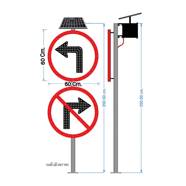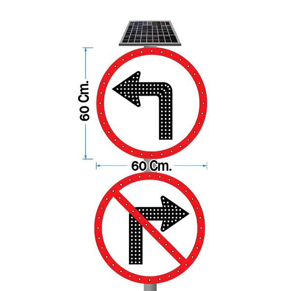 ป้ายเตือนให้เลี้ยวซ้ายห้ามเลี้ยวขวา ขนาด เส้นผ่านศูนย์กลาง 60 Cm. ระบบโซล่าเซลล์ (ไม่รวมเสา)