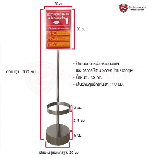 ป้ายสแตนเลสถังดับเพลิง ขนาดป้าย 20×30 Cm. ความสูงเสา 100 Cm.