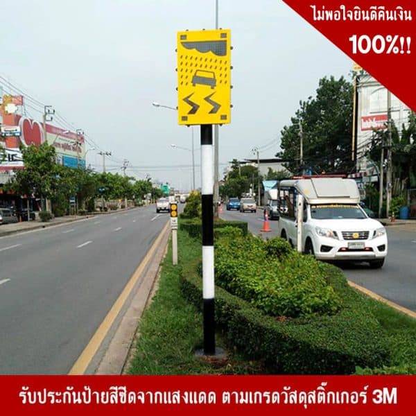 ลองใช้ ป้ายไฟกระพริบเตือนถนนลื่น แล้วผู้ใช้ถนนจะสามารถมองเห็นป้ายได้ชัดเจนในระยะ 1,000 เมตรทั้งกลางวันและกลางคืน