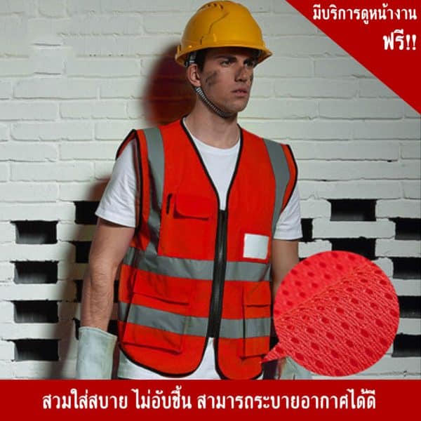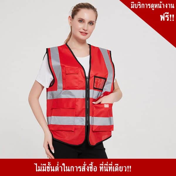 - เสื้อจราจรสีแดงพร้อมแถบสะท้อนแสง มีช่องใส่บัตร