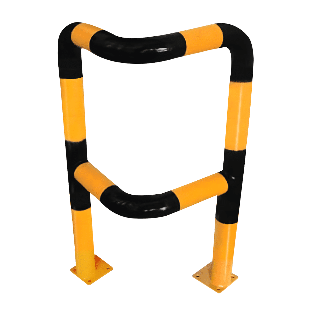 ราวเหล็กกันชนมุมโค้ง เส้นผ่านศูนย์กลาง 3 นิ้ว ความสูง 100x60x60 Cm. ทำสีเหลือง-ดำ เพลท 15×15 Cm