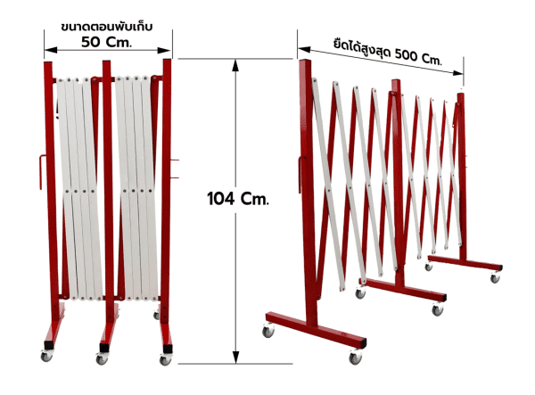 แผงกั้นเหล็กยืดหดได้ มีล้อ ยาว 500 cm. สูง 104 cm. สีขาว-แดง