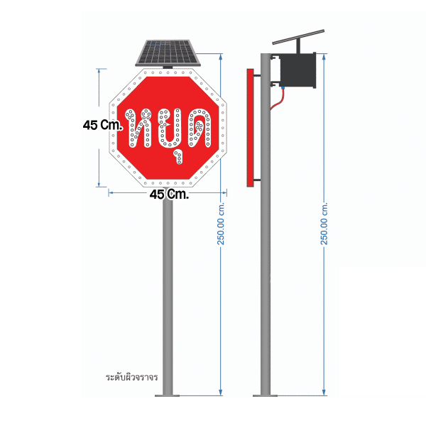 ป้ายหยุด 8 เหลี่ยมไฟกระพริบ ขนาด 45×45 Cm. ระบบโซลาร์เซลล์