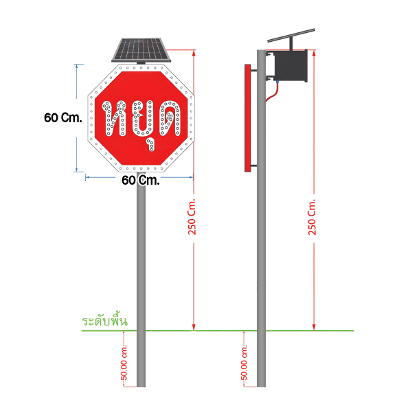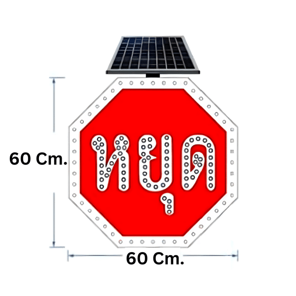 ป้ายหยุด 8 เหลี่ยมไฟกระพริบ ขนาด 60×60 Cm. ระบบโซลาร์เซลล์