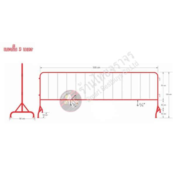 - ขอบแผงกั้นจราจรทำด้วยท่อเหล็ก มีเส้นผ่าศูนย์กลางขนาด 3/4 นิ้ว(6หุน) เป็นรูปสี่เหลี่ยมผืนผ้า มุมด้านบนทั้ง 2 ข้าง โค้งมน มีความยาว 300 เซนติเมตร สูง 110 เซนติเมตร ด้านล่างมีท่อเหล็ก ขนาดเดียวกันเชื่อมติด อยู่สูงจากพื้นเมื่อตั้งบนขาตั้งไม่น้อยกว่า 30 เชนติเมตร แล้วเชื่อมติดอยู่ กับขาตั้งที่ทำจากท่อเหล็กขนาดเดียวกัน ดัดโค้งงอมีความกว้างฐาน 50 เซนติเมตร สูง 10 เซนติเมตร และระหว่างขาตั้งกับแผงเหล็กมีท่อเหล็กเชื่อมติดไว้ข้างละ 2 ท่อน เพื่อเป็นการค้ำยึดระหว่างแผงเหล็กกับขาตั้ง