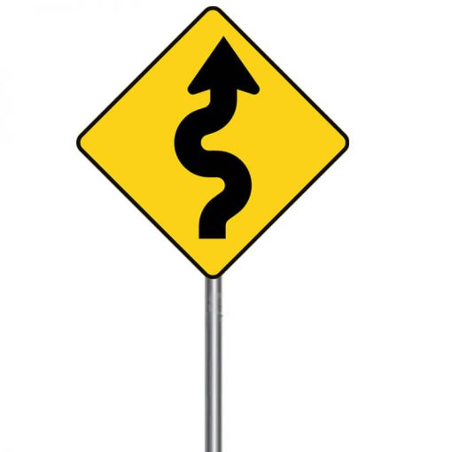 - ป้ายเตือนทางคดเคี้ยวเริ่มขวา ต.10 อลูมิเนียม หนา 1.2 mm. 45×45 Cm. 3M Safety Grade (รับประกัน 1 ปี)