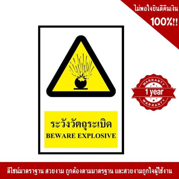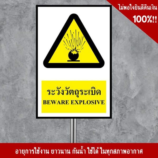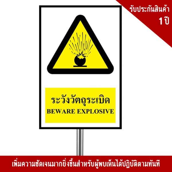 - ป้ายระวังวัตถุระเบิด อลูมิเนียม หนา 1.2 mm. 20×30 Cm. 3M Safety Grade (รับประกัน 1 ปี)