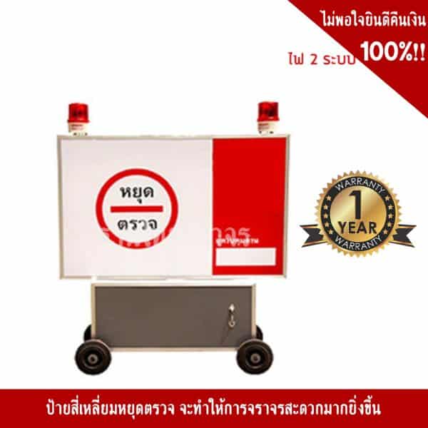 - ป้ายสี่เหลี่ยมหยุดตรวจแบบกล่องไฟมีล้อ ซึ่งทำให้เวลาใช้งานเคลื่อนย้ายได้เพื่อความสะดวกขึ้น 100%