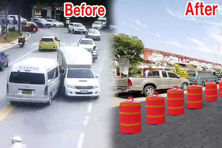 แผงกั้นพลาสติกบรรจุน้ำ สามารถกั้นแบ่งเลนจราจร ช่องจราจร ให้เป็นระเบียบ ลดการจราจรที่วิ่งคล่อมได้มากถึง 90% ช่วยลดอุบัติเหตุได้มากถึง 100%